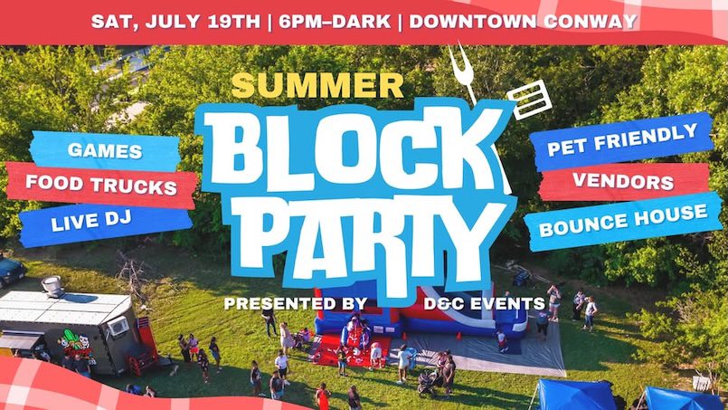 The 3rd annual Summer Block Party is planned for 6 p.m. until dark on Saturday, July 19, at 1212 Markham St. in Historic Downtown Conway. Presented by D&C Events, the evening includes live music, local food and free family fun!
