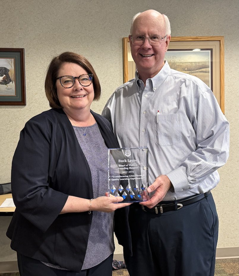 Layne, who has served on the Board of Visitors since its inception in 2017, concluded his service this year. At his final board meeting, he was presented with a plaque honoring his commitment, which reads: “Buck Layne, Board of Visitors Founding Member, 2017-2025 – Transforming Lives Through Quality Learning Experiences.”