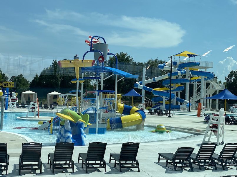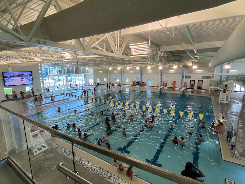 It features volleyball and pickleball courts, a 4,000-square-foot fitness center, party rooms, an outdoor pool with slides and a lazy river, indoor competition-swimming lanes and a toddler pool, and refreshments for purchase. Memberships are required.