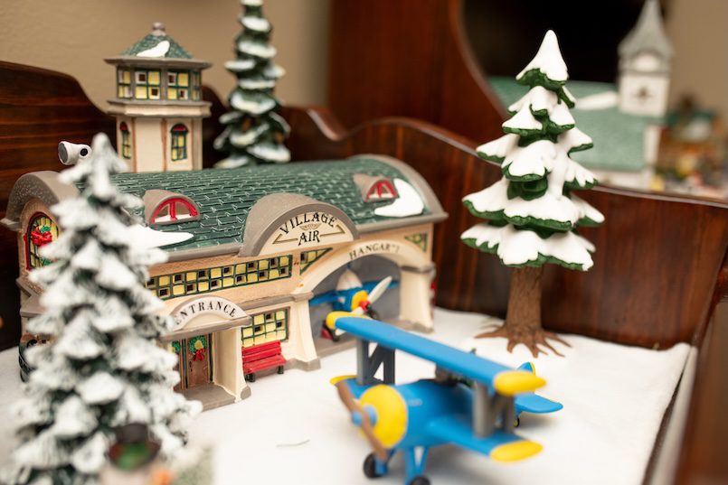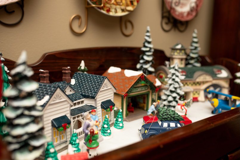 Their dining room table is flanked on three sides by Department 56 Village pieces. “This is my favorite story to tell,” she said. “Each one of these pieces relates to my family. This hospital represents my daughter Rebecca, who is a nurse. The Starbucks? My daughter Beth worked at one when she was in college. The Hartford House? My husband is from Hartford, Conn.” On the table is a set of Spode Christmas china that Mac gave her one Christmas.