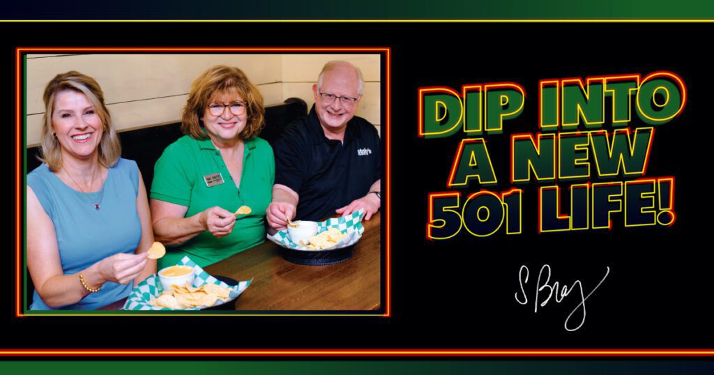 Please join me for one final summer adventure as we explore the many ways that the “501 Means Business.” We begin with Patti and David Stobaugh on the cover as they celebrate 45 years of Stoby’s! Nestled in the historic district of Conway, and within walking distance of Conway Regional Hospital and the University of Central Arkansas, the restaurant is famous for its signature Cheese Dip or Spicy White Queso, the Stoby breakfast, the Stoby sandwich, and — my personal favorites — possum pie and Italian cream cake. Several dessert recipes can be traced back to Florence Smith, who sold her pie business location to David back in 1980, and then went to work for him as Stoby’s first employee! In 45 years, the Conway eatery has kept the same address.