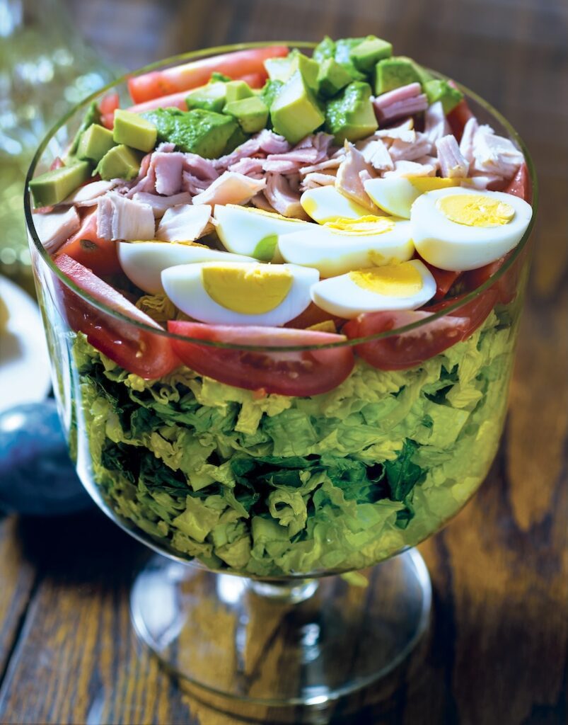 Rinse and chop hearts of romaine lettuce into bite-size pieces; chill. Slice deli turkey into half-inch cubes. Peel hard-boiled eggs and slice. Slice avocados in half and remove pit; peel and cut into small chunks. Rinse lime and slice in half. Squeeze fresh juice over avocado and toss. Clean and slice tomatoes into eight sections. Arrange salad ingredients in a glass bowl. Cover and chill before serving with dressing.