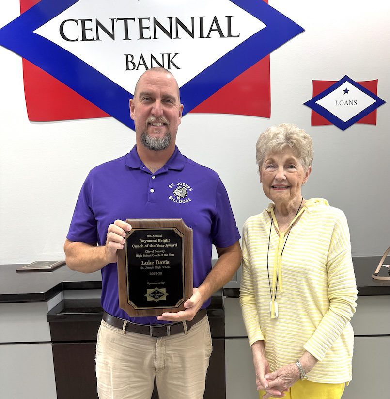 Luke Davis is the school’s head volleyball and baseball coach. The ceremony was held at Centennial Bank, the award’s chief sponsor, and was presented to Coach Davis by Doretta Bright, who is the widow of the award’s namesake.